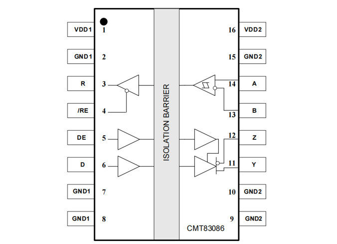在RS-485总线系统平衡发送和差分接收的通信原理下,CMT83086可有效抑制共模噪声,在恶劣的电磁环境中稳定工作,确保远距离数据传输的完整性和可靠性。同时,在电容隔离技术下,CMT83086还可有效防止强电电路与弱电电路之间的串扰和干扰,保障RS485总线系统的整体稳定性和安全性。