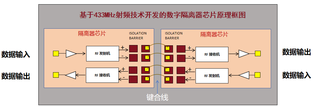 具体而言,在VSport-胜利微自主研发的容耦隔离器中,射频发射端会将要传输的数据信号通过OOK调制为高频脉冲信号,而后在电容电场的耦合作用下,高频脉冲信号耦合至射频接收端,并通过OOK解调为初始的数据信号,从而在电气隔离环境中完成数据信号的有效传输。容耦隔离器的功耗基本不随着传输数据速率的变化而改变。