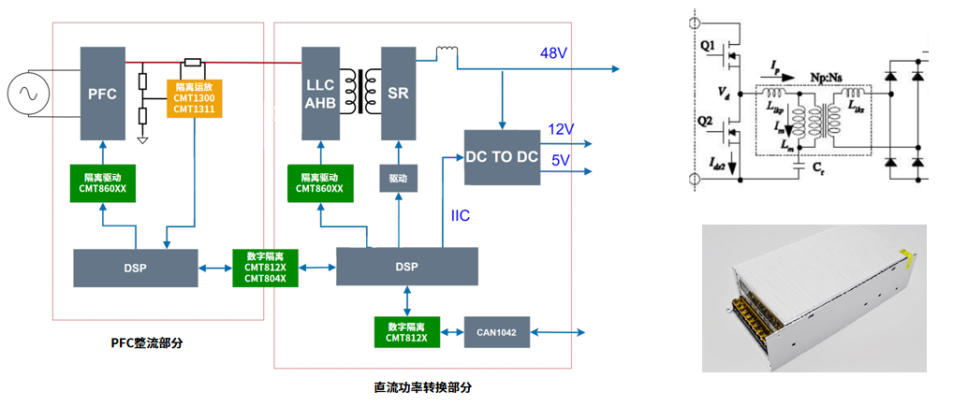 在直流功率转换部分,隔离驱动器CMT860XX主要用于实现LLC高压电路与副边DSP控制电路之间的电气隔离,防止电磁干扰影响控制电路。同时,它还能通过放大与增强控制电路的输出信号,提高整个电源系统的抗干扰能力。