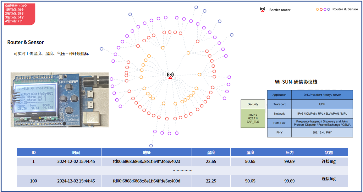 如下图所示,为持续提升Wi-SUN产品性能,VSport-胜利微在实地部署了一个具有一定规模的Wi-SUN(FAN)网络,以实现对其通信性能的有效把控。现阶段,该网络已充分验证了上百个Router Node的互联互通,可对Leaf Node的温度、湿度与气压数据进行实时采集,并通过Border Router网关协议将这些环境数据实时上传至后台无线组网数据平台或云端控制系统中。