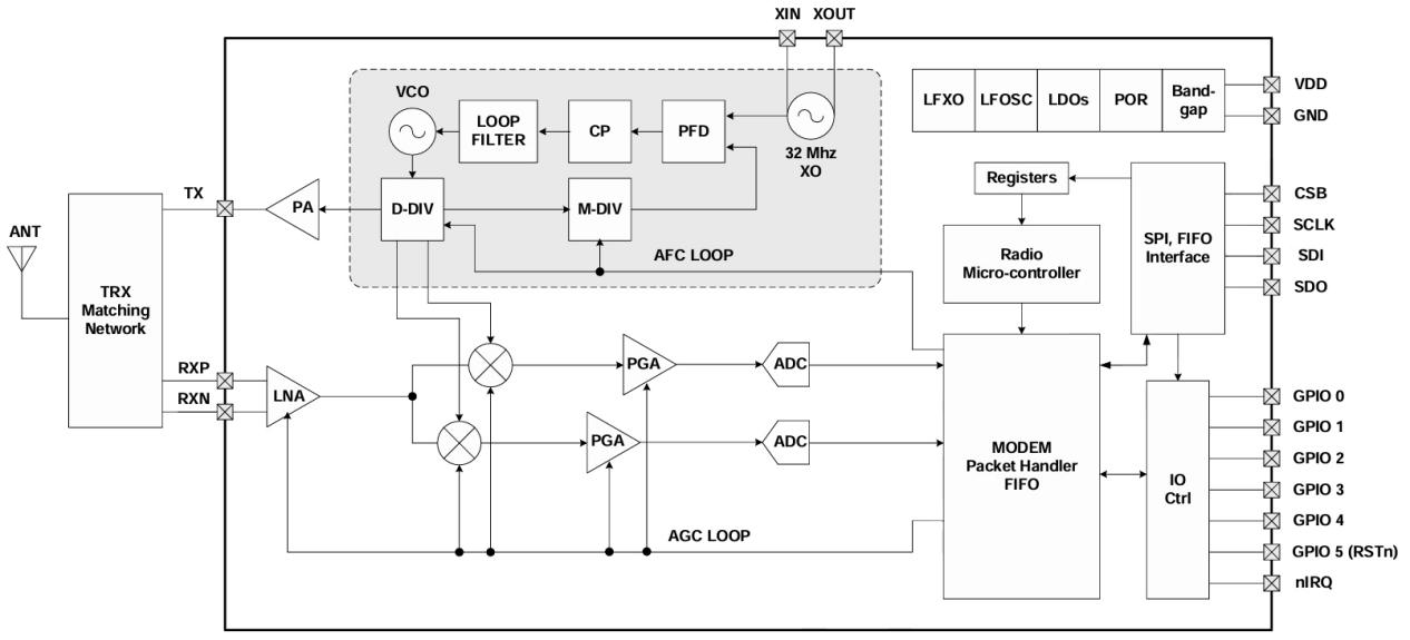 CMT2310A射频接收链路采用了LNA+MXR+PGA+ADC+PLL的低中频结构,射频发射链路采用标准的PLL+PA结构,无需额外增加射频开关器件,即可拥有良好的发射与接收射频性能。当CMT2310A工作在有强带外干扰的环境时,器件可通过自动增益控制环路调节系统的增益,即可获得最佳的系统线性度、选择性与灵敏度等性能。