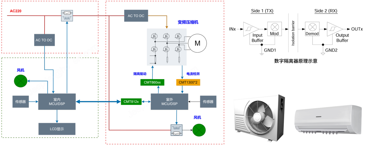 CMT860XX系列隔离栅极驱动器可用于连接空调外机中低压控制电路与高压变频器电路,能有效阻断高低压“窜流”,保护MCU控制电路,同时抑制共模噪声、电磁干扰、地电位差等不良干扰,并放大PWM(脉冲宽度调制)信号从而精准控制压缩机的转速,提升空调能效。
