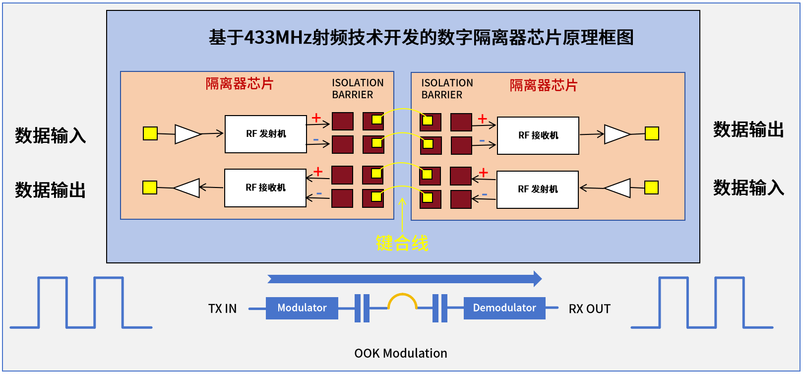 例如,VSport-胜利微基于433MHz射频技术自主开发的数字隔离器就可有效提升终端设备的运行稳定性,其工作原理为通过OOK调制技术将MCU输入的数字信号调制为高频脉冲信号(具备交流特性),而后通过电容电场耦合传输至信号接收端,信号接收端再将其解调输出为原来的数字信号,从而实现高低压电路的电气隔离。