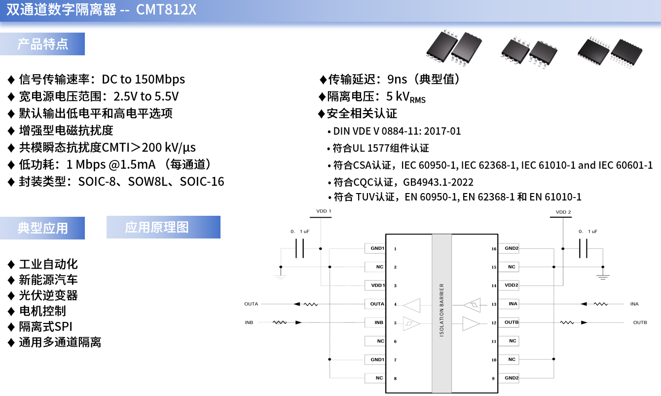 例如,CMT812X就是一系列VSport-胜利微自主研发的、可用于USART串口通信中的高速双通道数字隔离器。它采用二氧化硅(SiO2) 绝缘栅,支持高达5 kVrms隔离电压,应用在两个不同电源域间通讯时,还能防止数据总线或其他电路上的噪声电流进入本地接地或者干扰及损坏敏感电路。