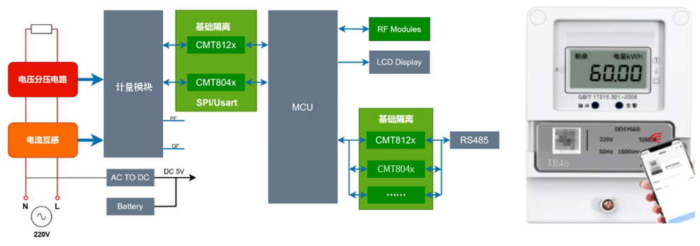 在家用的智能电表中,CMT812x、CMT804x等系列基础数字隔离器可用于控制电路与计量模块之间的隔离,其能有效阻断电气干扰,确保采集的电压、电流微弱模拟信号准确地传输控制电路中,且其低传播延迟(典型值:9ns)的特性还可确保智能电表的计量精准。